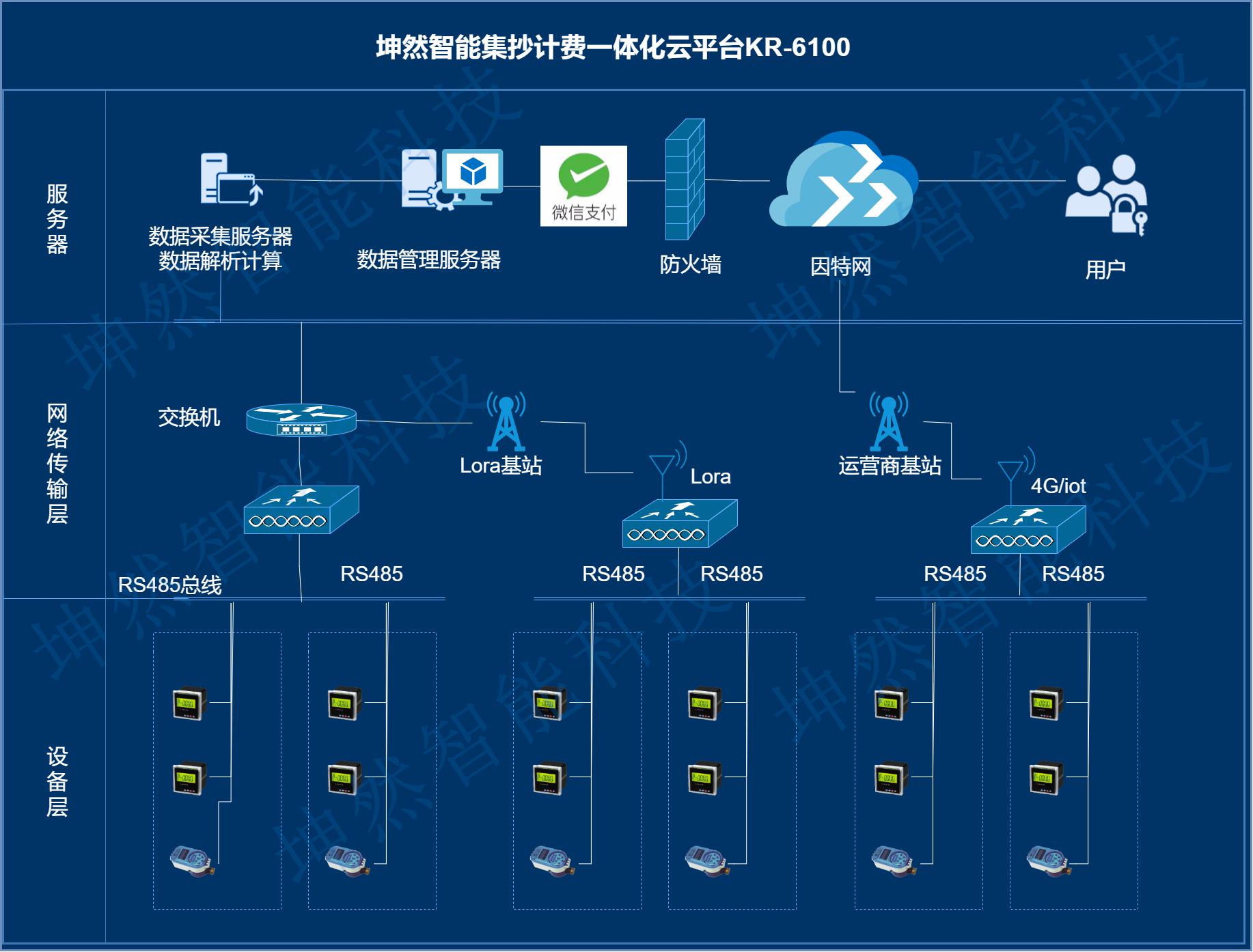 《坤然智能KR-6100集抄計(jì)費(fèi)一體化云平臺(tái)》由系統(tǒng)中的各計(jì)量裝置、數(shù)據(jù)采集傳輸終端、數(shù)據(jù)中心組成。