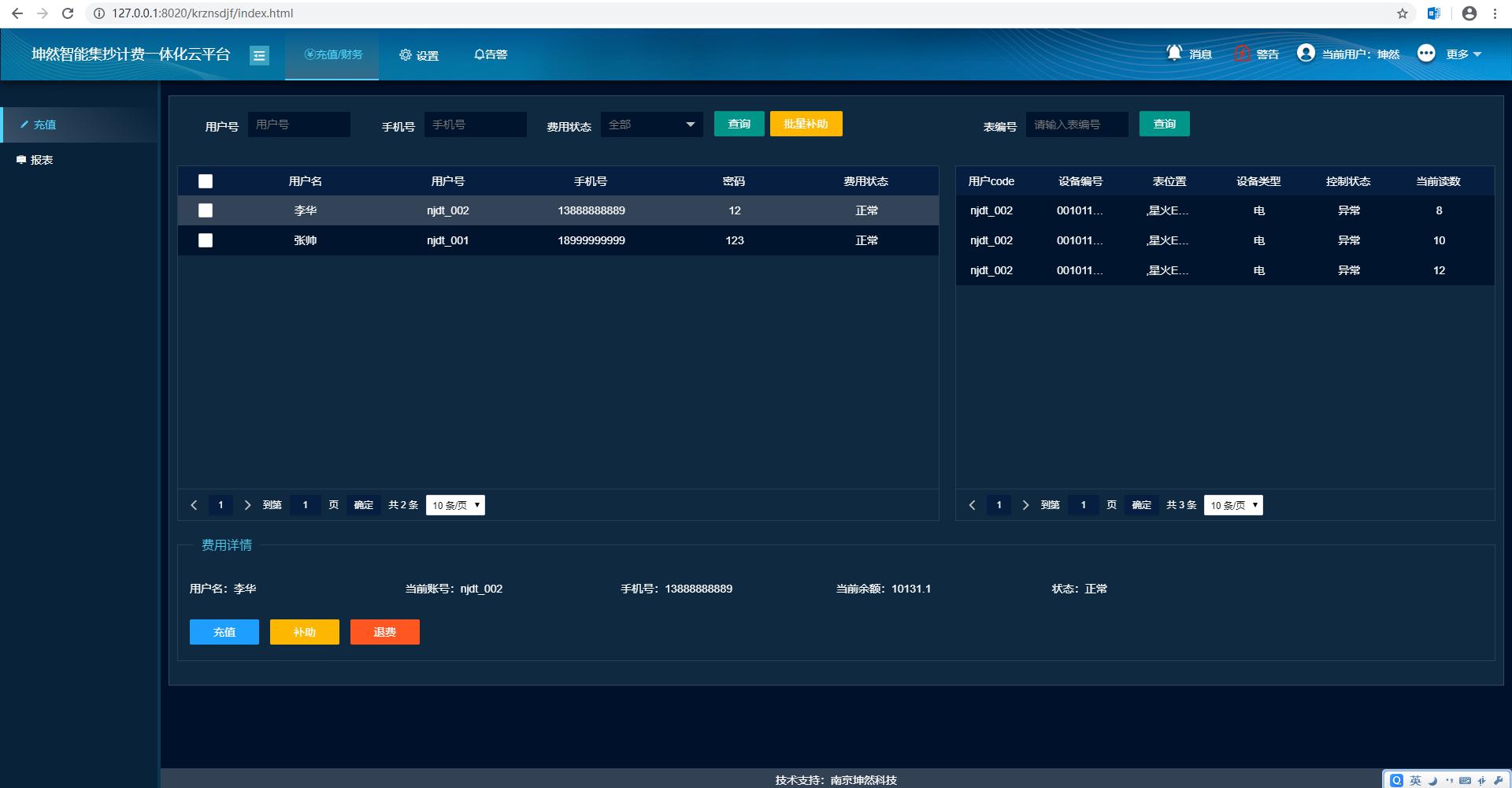 ? 費(fèi)用報(bào)表:用戶和管理員都可查詢預(yù)付費(fèi)表或管控表每天的用能狀況;可提供能耗分析+財(cái)務(wù)軌跡一體式綜合管理報(bào)表,包含用戶表財(cái)務(wù)數(shù)據(jù)等數(shù)據(jù);