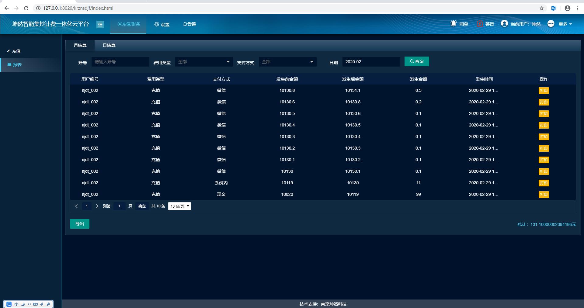 報(bào)表分析:可查看系用戶所有的充值繳費(fèi)扣費(fèi)記錄。